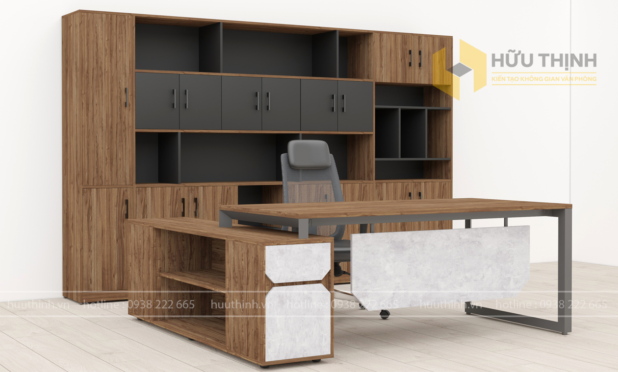 Bàn lãnh đạo kết hợp chân sắt là một sự kết hợp giữa vật liệu gỗ hoặc gỗ công nghiệp cho mặt bàn và chân sắt cho cơ cấu chân bàn. Đây là một xu hướng phổ biến trong thiết kế nội thất văn phòng hiện đại. Chân sắt mang đến sự chắc chắn và hiện đại cho bàn, giúp bàn có độ bền cao và phù hợp với nhiều phong cách thiết kế nội thất văn phòng khác nhau.
