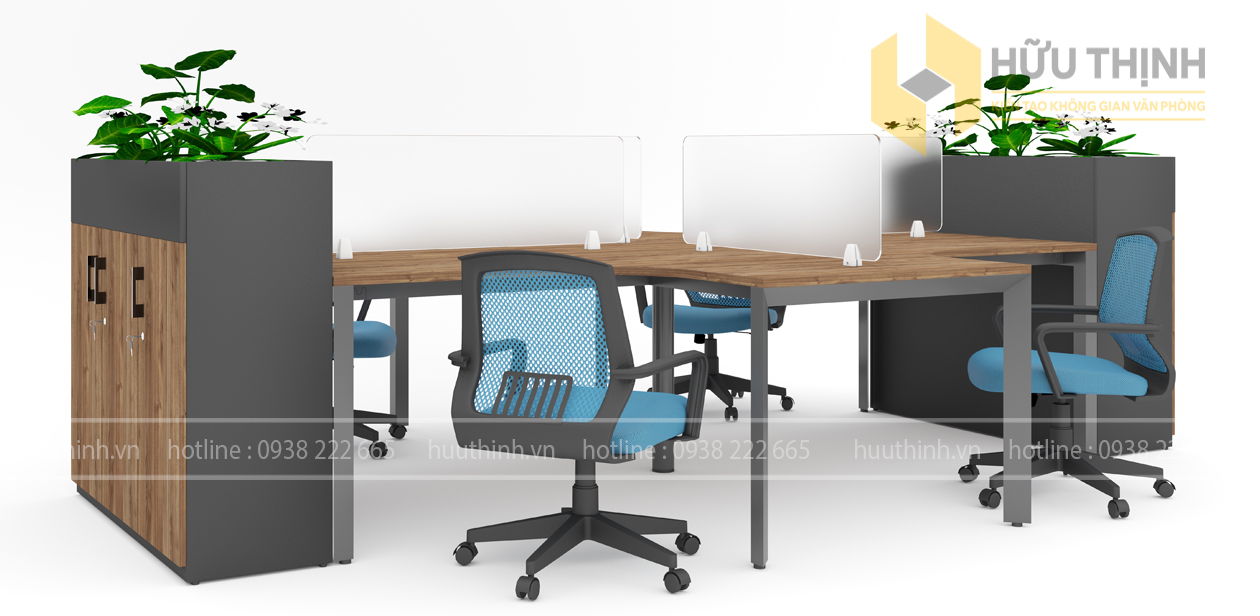 Cụm Bàn Module chữ L kết hợp tủ cây xanh.