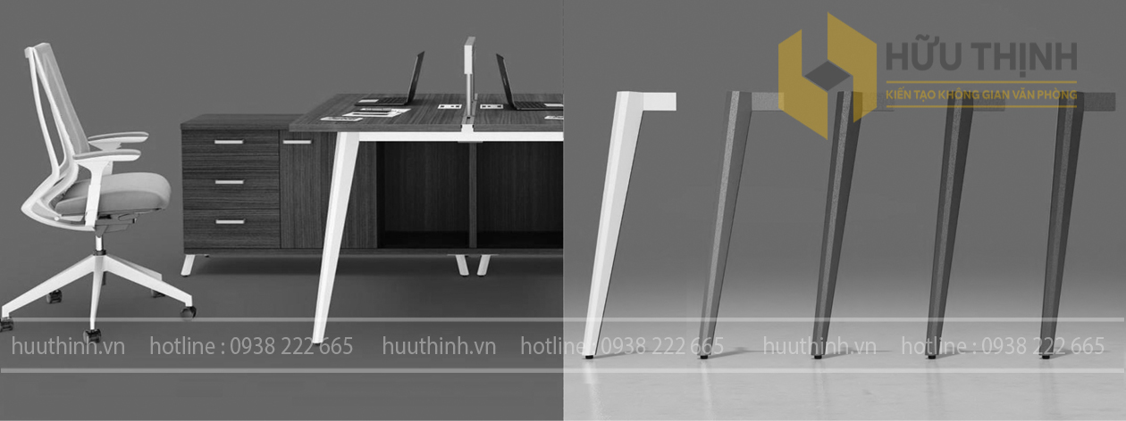 Cụm Module bàn làm việc chân sắt định hình là một loại bàn làm việc có chân bàn được làm bằng thép hoặc sắt và có thiết kế định hình độc đáo như: Tam giác, Oval, côn, côn 2 tầng, vuông, chữ nhật...và một số định hình khác(các bạn có thể tới văn phòng trưng bày các sản phẩm bàn chân sắt tại Hữu Thịnh Cần Thơ) Chân bàn sắt định hình là điểm nổi bật của cụm module này. Chúng thường có thiết kế độc đáo và thường được làm bằng thép hoặc sắt, tạo nên một nét đặc trưng cho bàn làm việc. Các chân bàn có thể được sơn tĩnh điện để bảo vệ khỏi gỉ sét và tạo ra vẻ ngoại hình hiện đại