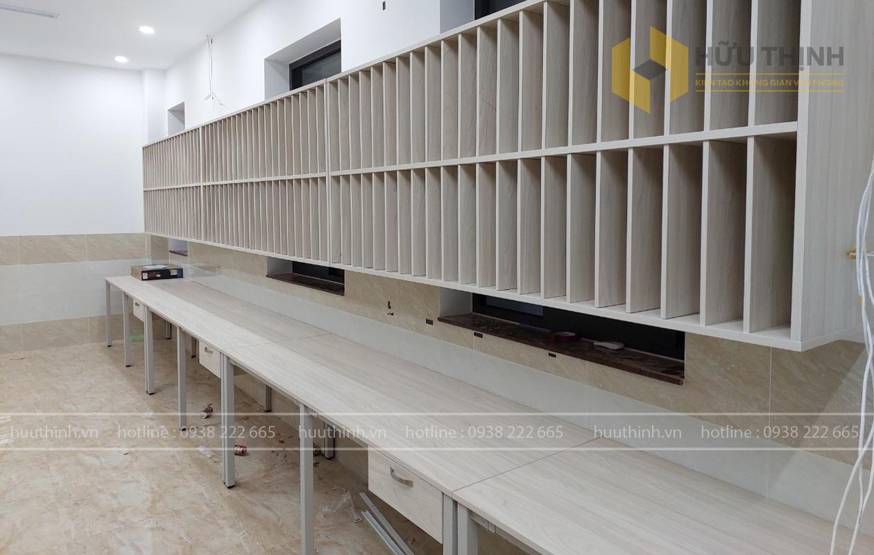 Với yêu cầu có một nơi làm việc có thiết kế văn phòng không gian mở, cùng với phòng kỹ thuật với bàn và tủ có yêu cầu chuyên biệt cho việc bảo trì sủa chữa cũng như lưu giữ các loại máy tính laptop. Nội Thất Hữu Thịnh đã cùng chủ đầu tư lên phương án thiết kế và thực hiện các hàng mục sau: