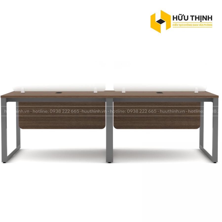 - Chất Liệu mặt bàn: Mặt bàn chữ nhật, được sử dụng gỗ MFC phủ Melamine chống trầy cao cấp dầy 25mm (màu gỗ tự chọn), yếm gỗ 18mm, vách ngăn kính cường lực hoặc sắt sơn tĩnh điện.