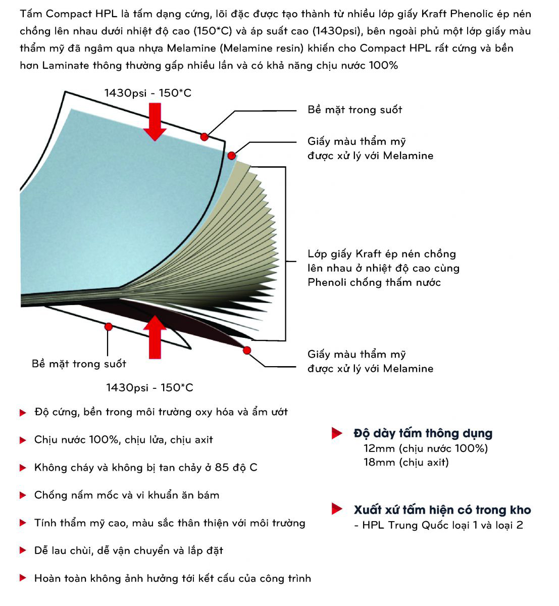 Vách ngăn vệ sinh Compact là loại dạng tấm được chế tạo từ vật liệu Compact HPL, HPL (High Pressure Phenolic). Đây là dạng vật liệu được chế tạo từ nhựa Phenolic nén ép chồng nhiều lớp lên nhau ở điều kiện áp suất lớn, ước tính khoảng 1430 PSI. Từ đó, cho ra thành phẩm có độ bền và có độ cứng cao.