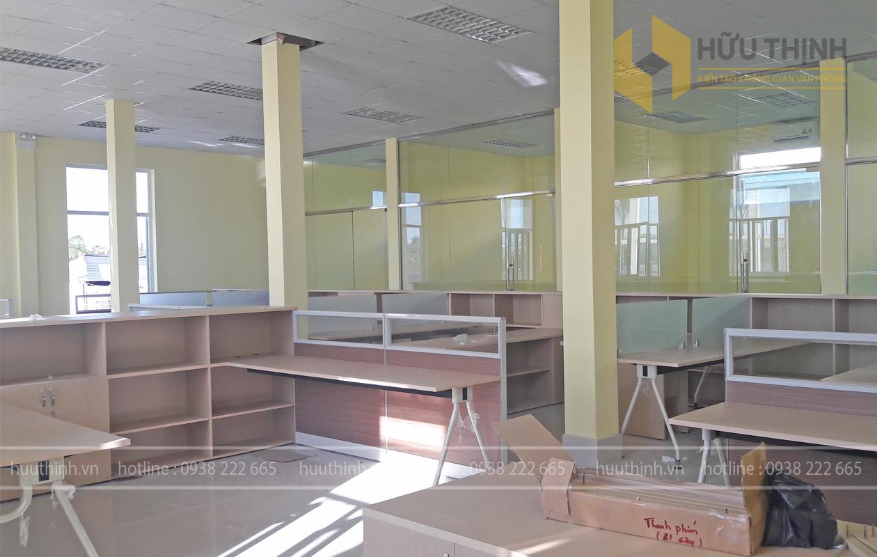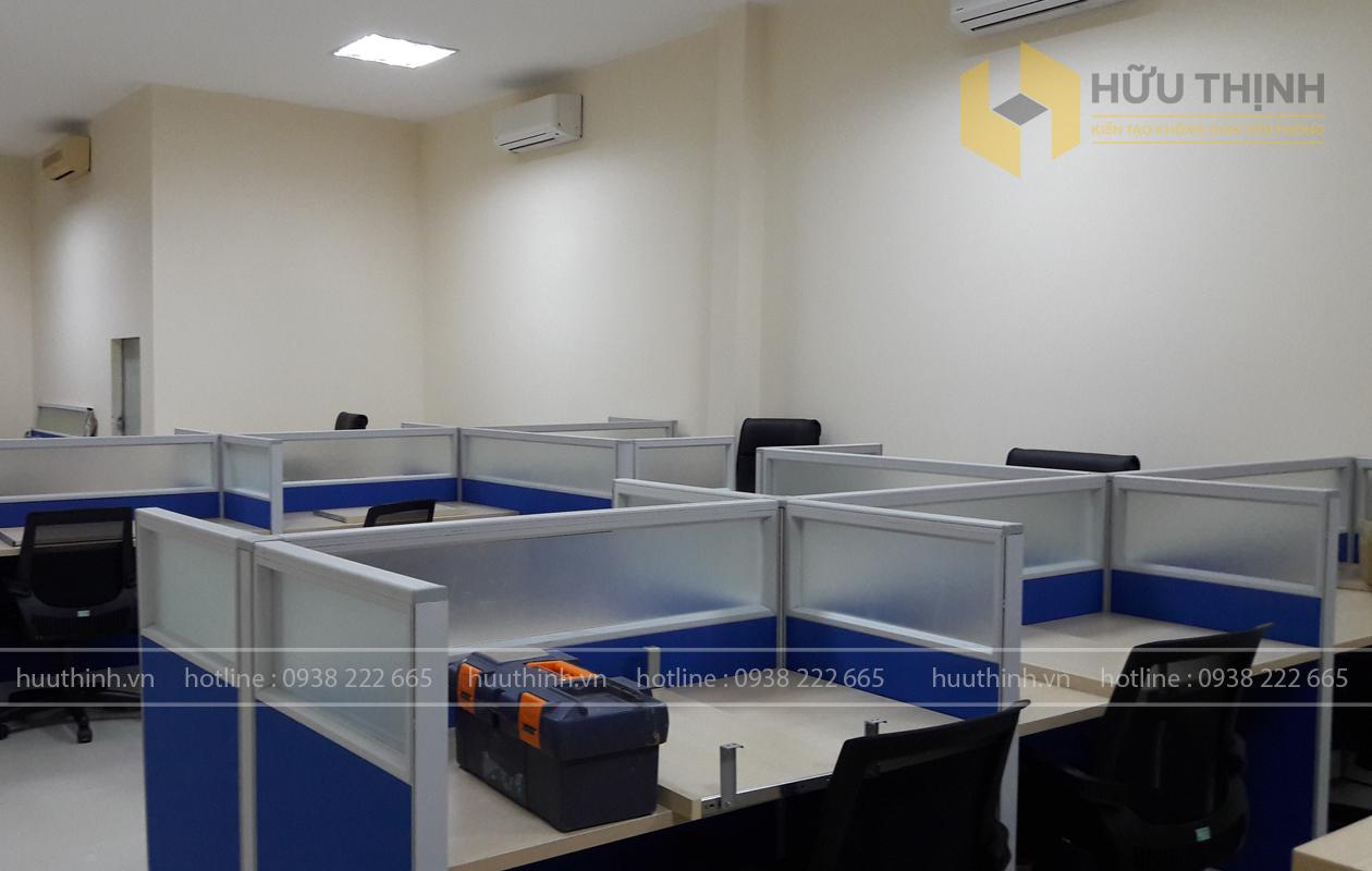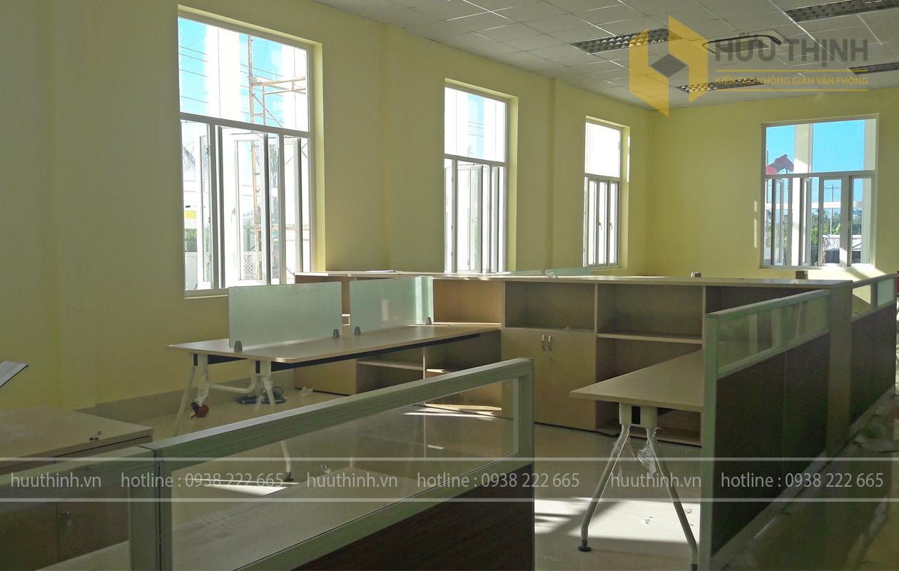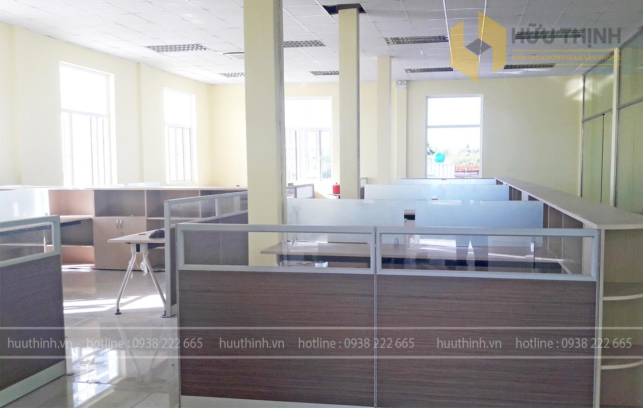 Khu văn phòng làm việc được thiết kế theo phong cách văn phòng mở, với các cụm Module bàn làm việc chân sắt sơn tĩnh điện cao cấp kết hợp với tủ hồ sơ tạo thành các vách ngăn giữa các bộ phận làm việc. Vách ngăn văn phòng được sử dụng kính cường lực phun cát mờ tạo sự nhẹ nhàng giữa các vị trí làm việc với nhau.