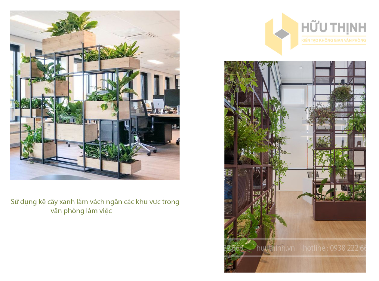 Bố trí hệ thống cây xanh và cây cỏ trong văn phòng tạo ra không gian xanh mát, giúp cải thiện chất lượng không khí và thúc đẩy cảm giác thư thái. Bạn có thể đặt những kệ cây xanh tạo ra các vách ngăn giữa các khu vực, tủ hồ sơ bên trên có thể để cây xanh, đặt các chậu cây trên bàn làm việc, trên cửa sổ, hoặc trong các khu vực chung của văn phòng.