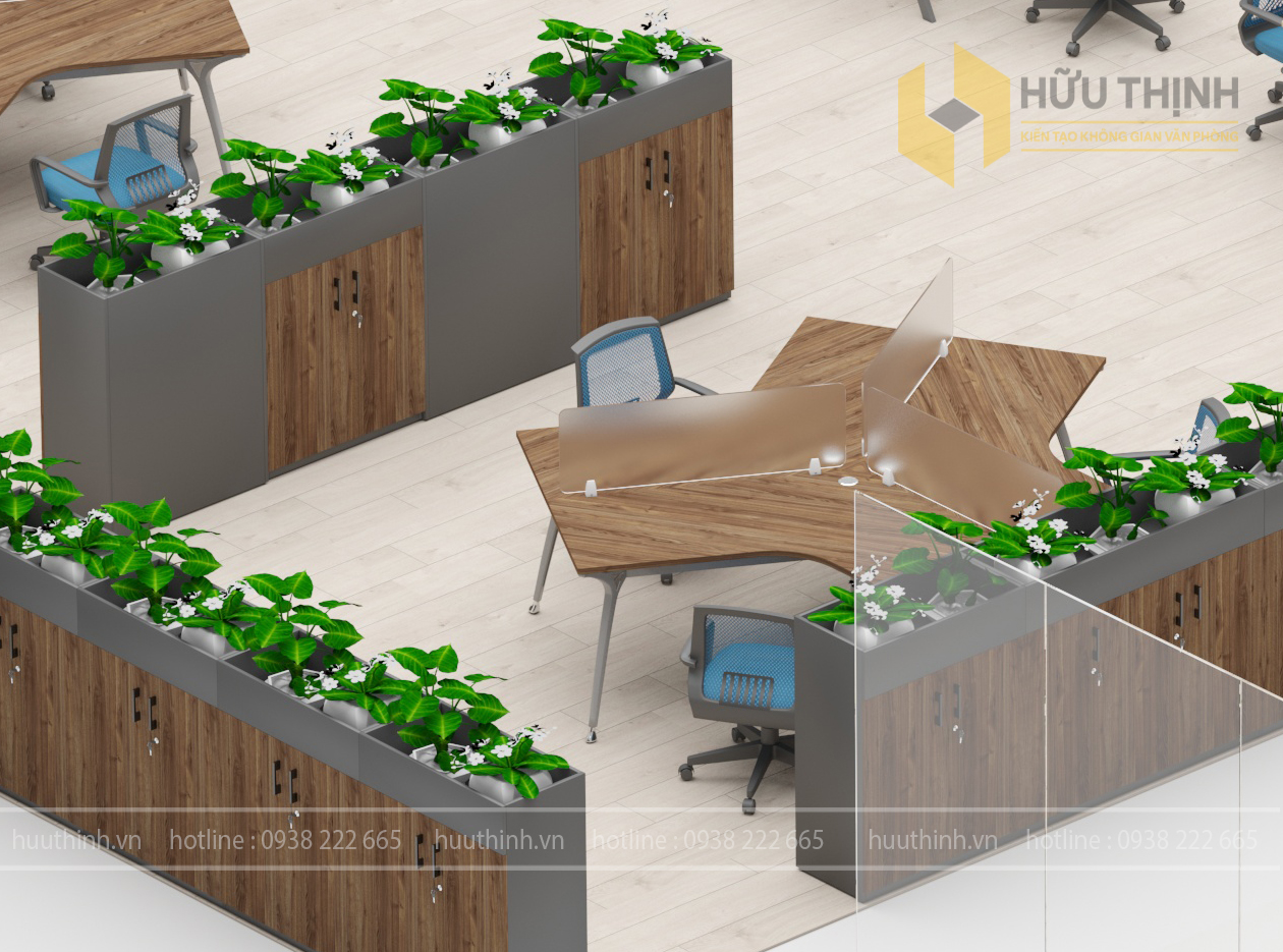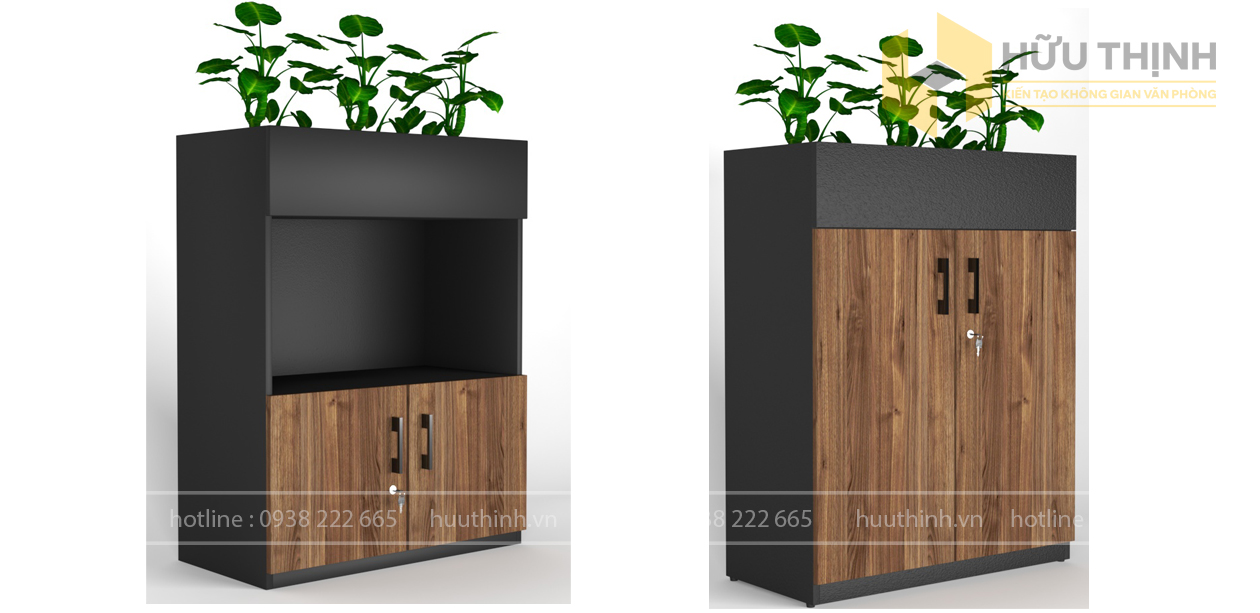 Loại tủ hồ sơ có kệ để cây xanh đang là một xu hướng về thiết kế nội thất văn phòng xanh, tủ thường được để vị trí các đầu cụm bàn làm việc hoặc để tạo thành các vách ngăn văn phòng có hay xanh, tạo ra một không gian văn phòng làm việc mở.