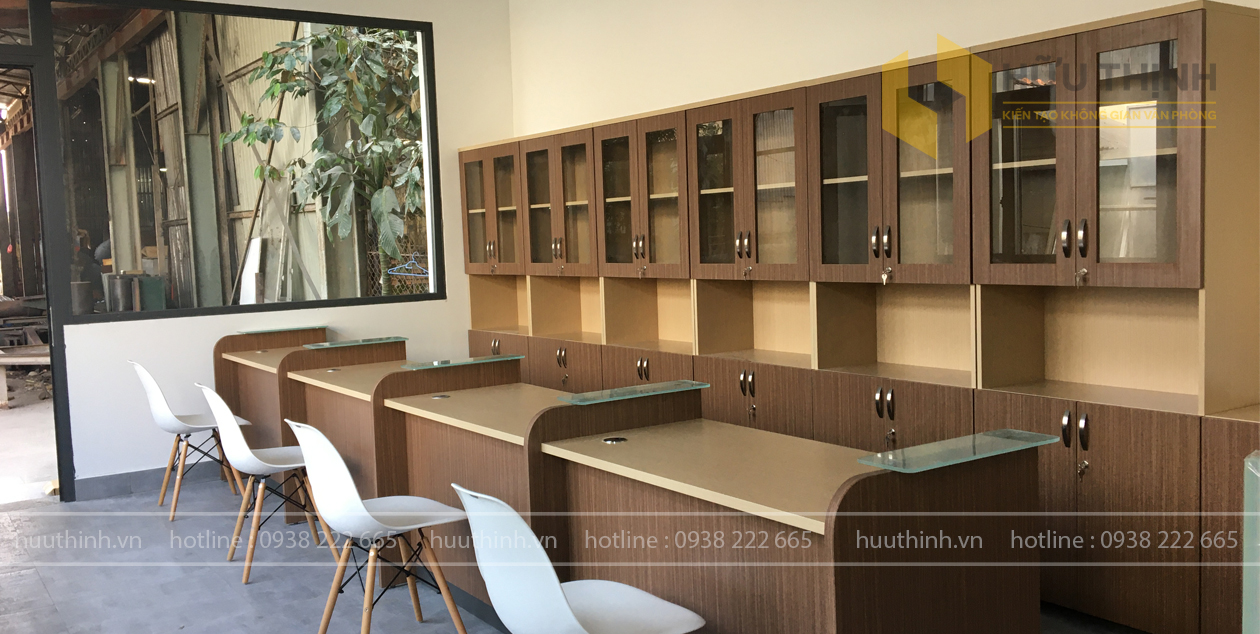 Hệ thống tủ hồ sơ gỗ được bố trí phía sau bàn tư vấn.